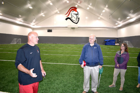 - Photo by Clay Schuldt Martin Luther College Assistant Athletic Director Randy Cox, left, gives Mayor Terry Sveine and members of the Willkommen Committee of the New Ulm Area Chamber of Commerce a tour of the interior of MLC’s Betty Kohn Fieldhouse following a ribbon cutting to officially open the facility on Thursday.